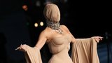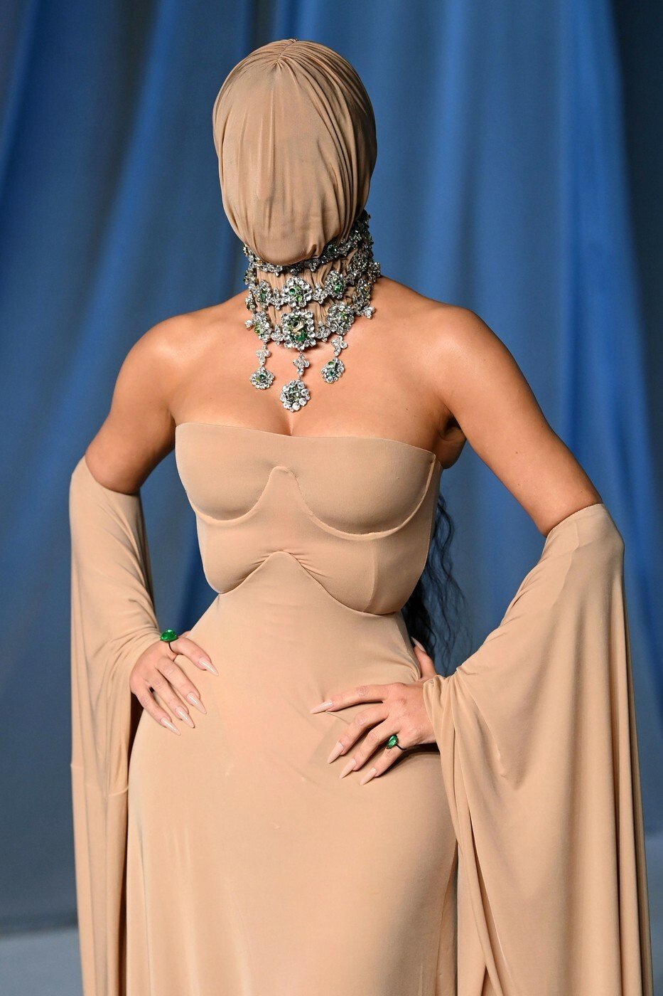- Kim Kardashianová byla na Academy Museum Gala rozhodně nepřehlédnutelná. V oslnivých šatech od značky Maison Margiela z kolekce jaro 2025 haute couture nechala vyniknout díky utaženému korzetu své postavě: především vosímu pasu. Působivou róbu však doplnila extravagantní maskou z totožné látky, která jí zakrývala celou hlavu, a obrovským límcem sahajícím až k bradě, zdobeným masivním náhrdelníkem. Údajně měla pod tím vším kompletní účes i make-up... ale maska stejně vše zakrývala...9.