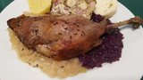 ● Husí kaldoun 85 Kč ● Husí stehno, dva druhy zelí a bramborové šulance