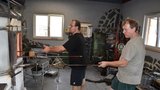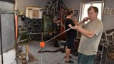 Roman Míček s kolegou Rudolfem Petrášem při výrobě historického zeleného lesního skla. Karel Janeček