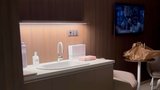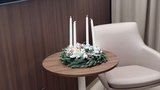 Ve stěně je zabudovaná dětská vanička se sprchou a opodál přebalovací pult. Na Míšu čekalo překvapení na stolku, a to v podobě adventního věnce. Nechybí dvě křesílka, televize a minibar s nealkoholickými nápoji. Opravdu krásné místo.