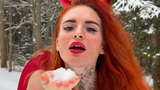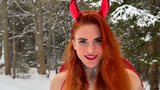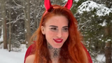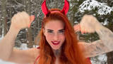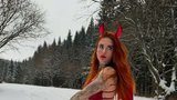 Už při pohledu na ni musí být ale všem jasné, že tohle focení muselo být náročné. Vždyť měla na sobě sotva pár proužků látky a k tomu velké a huňaté sněhule. Červené spodní prádlo doplnila stylovou čertovskou čelenkou s rohy.