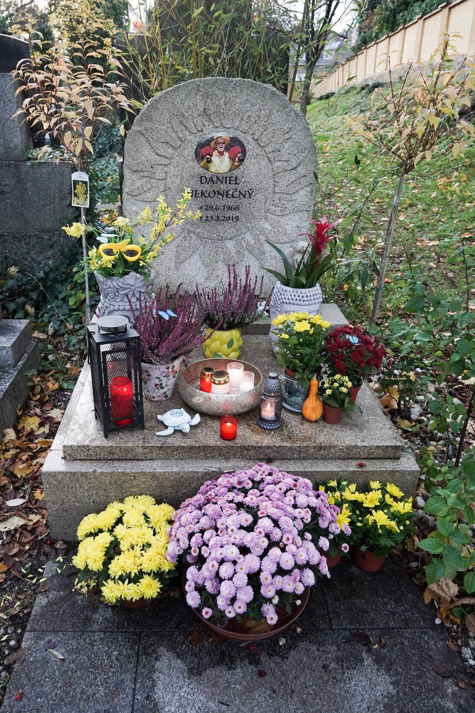 Několik zapálených svíček a jedna květina vedle druhé, hrající mnoha barvami, tak to vypadá na místě věčného odpočinku Daniela Nekonečného. O hrob se pečlivě stará především jeho bývalá partnerka Zuzana Kardová, která se loni nechala slyšet, že na místo dochází každý týden.