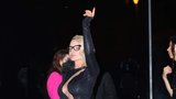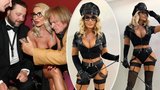 Ten se skládal v podstatě jen z černých kalhotek a kratičké blůzky s pořádně hlubokým výstřihem. S doplňky si ale vyhrála… nechyběly latexové kozačky, podvazky, černé rukavice, kožené náramky s oky, lesklá brigadýrka, a dokonce ani bičík na neposlušné rošťáky.