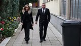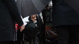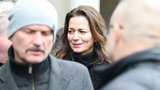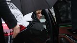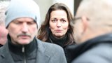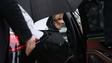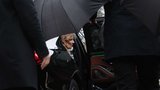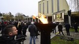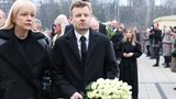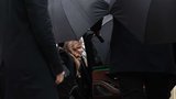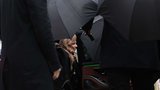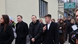 Průvod v čele s Leošem Marešem a jeho ženou Monikou vchází branou do areálu krematoria.