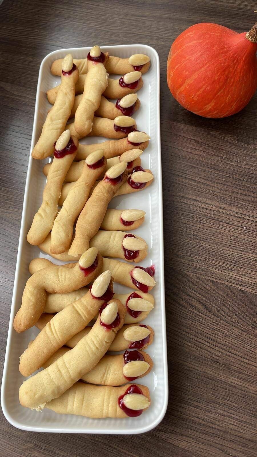 Postup: Smícháme mouku, cukr, máslo, vejce a sůl, vypracujeme hladké těsto. Zabalíme a necháme v chladničce asi 30 minut. Těsto vyválíme, vykrájíme – uděláme záhyby pomocí nože, aby vypadaly jako klouby. Poté je potřeme marmeládou a na konec každého prstu položíme mandli jako nehet. Pečeme při 180 °C cca 12 – 15 minut, než prsty jen lehce chytí zlatavou barvu.