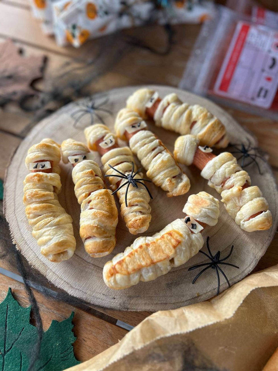 Postup: Listové těsto nakrájíme na proužky. Každý párek obmotáme proužkem těsta tak, že necháme u hlavy malou mezeru. Položíme mumie na plech vyložený pečicím papírem a na obličej mumie dáme kousek sýra s malými kousky černých oliv jako oči. Pečeme při 200 °C cca 15 – 20 minut, dokud těsto nezezlátne. Podáváme ideálně s krvavým kečupovým dipem.