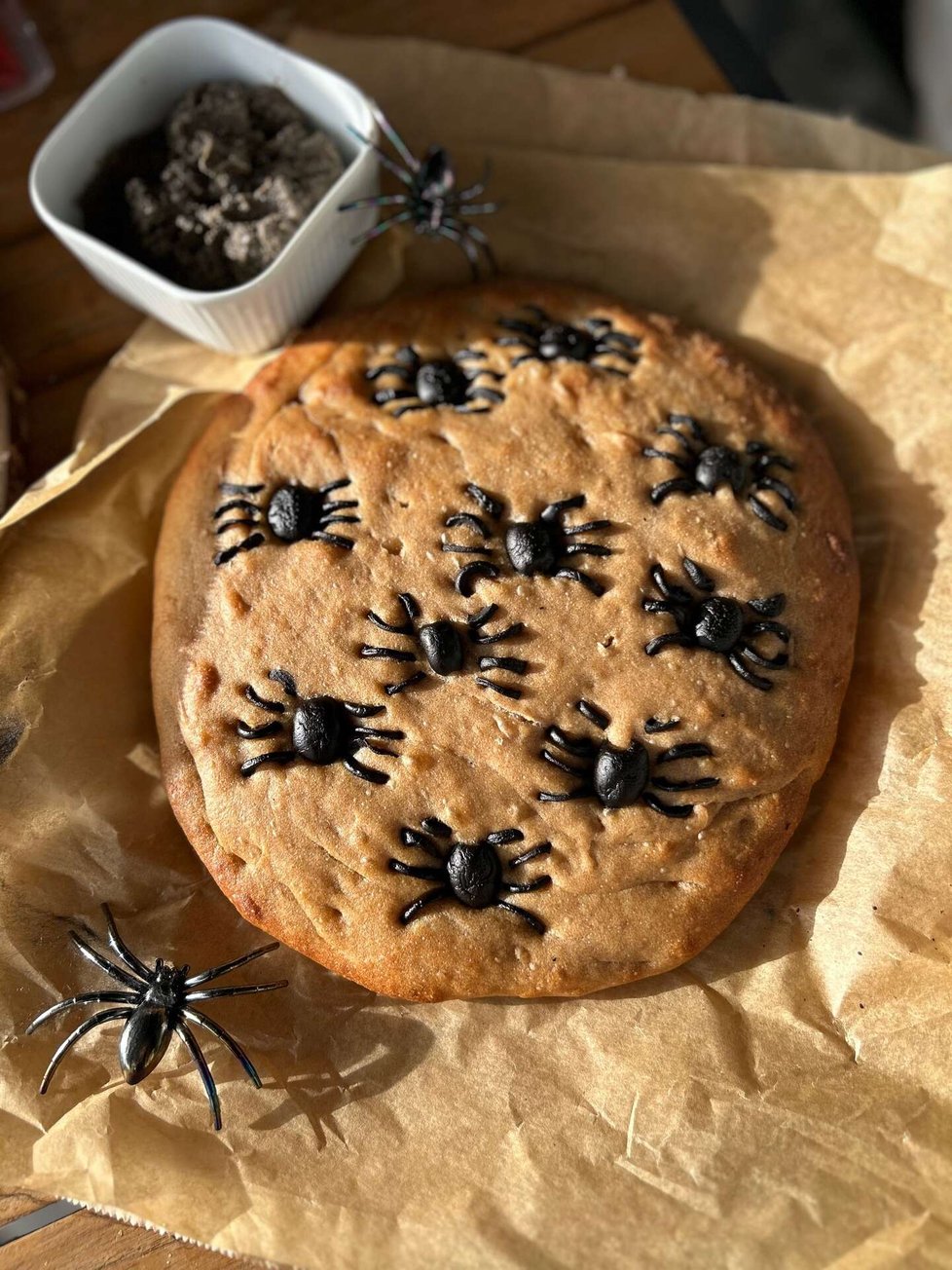 Postup: V míse smícháme mouku, droždí, sůl, olivový olej a vodu. Vypracujeme těsto, necháme přikryté kynout cca 45 minut. Těsto rozložíme na plech s pečicím papírem. Černé olivy rozpůlíme, jedna půlka tělo pavouka a druhou půlku nakrájíme na kousky nožičky. Vtlačíme do těsta na plechu. Pečeme při °C cca 15 – 20 minut, dokud nezezlátnou.